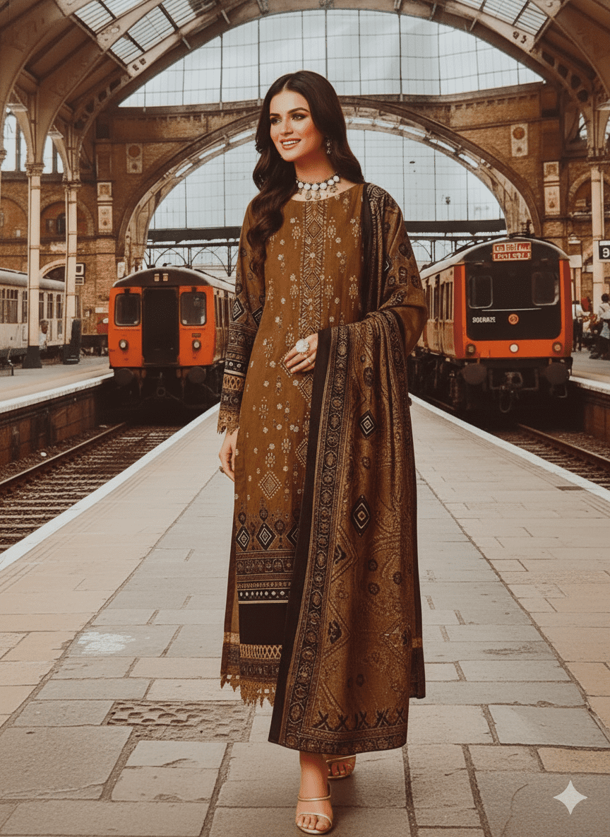 Embark on a journey of timeless beauty with the Amber Voyage Dhanak Unstitched Elegance – 3 Piece set, where an intricately embroidered shirt fabric in warm amber tones captivates with delicate gold and black motifs. The printed shawl, adorned with elegant patterns, flows with effortless grace, while the dyed trouser material in rich amber ensures supreme comfort and a tailored fit. Perfect for crafting a stunning outfit for festive occasions, cultural events, or chic outings, this ensemble promises to elevate your style with luxurious charm and undeniable sophistication!
