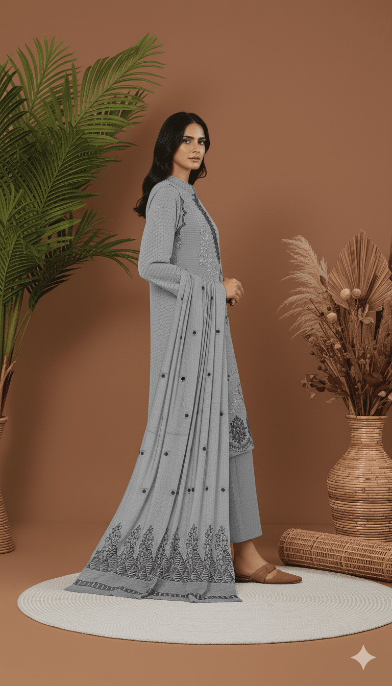 Unveil timeless poise with Chmki Dhanak’s refined 3-piece unstitched collection: the Embrioded Shirt, Vlvet Pulo Shawl, and Chmki Trouser in serene Grey. Adorned with delicate, heritage-inspired embroidery that whispers elegance, this ensemble is woven from premium, soft fabrics for superior drape and all-season versatility. The velvet shawl lends a sumptuous layer, ideal for elevating winter evenings or festive transitions. Suited for weddings, parties, and sophisticated gatherings, it empowers effortless customization to reflect your inner grace. In the tranquil Grey palette, embrace a symphony of subtlety and strength—where every stitch crafts stories of enduring beauty and quiet luxury.