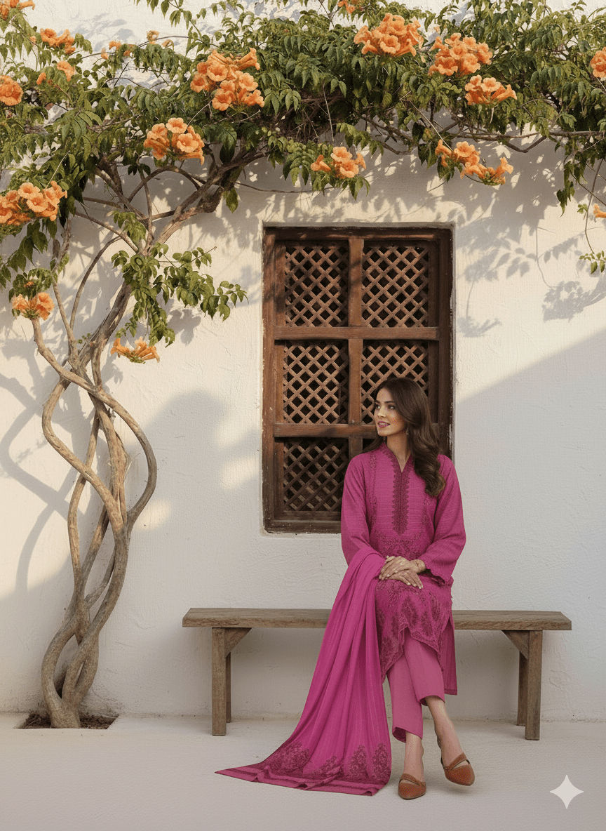 : Elevate your wardrobe with the captivating Chmki Dhanak 3-piece unstitched collection: the Embrioded Shirt, Vlvet Pulo Shawl, and Chmki Trouser in stunning Magenta. This luxurious set features exquisite embroidery that blends timeless heritage with modern flair, crafted from premium, breathable fabrics for effortless drape and comfort. The velvet shawl adds a touch of opulent texture, perfect for layering in transitional seasons. Ideal for weddings, parties, and festive gatherings, it exudes sophistication and joy, allowing you to create personalized looks that turn heads. Indulge in the vibrancy of Magenta—where elegance meets enduring style for unforgettable moments.