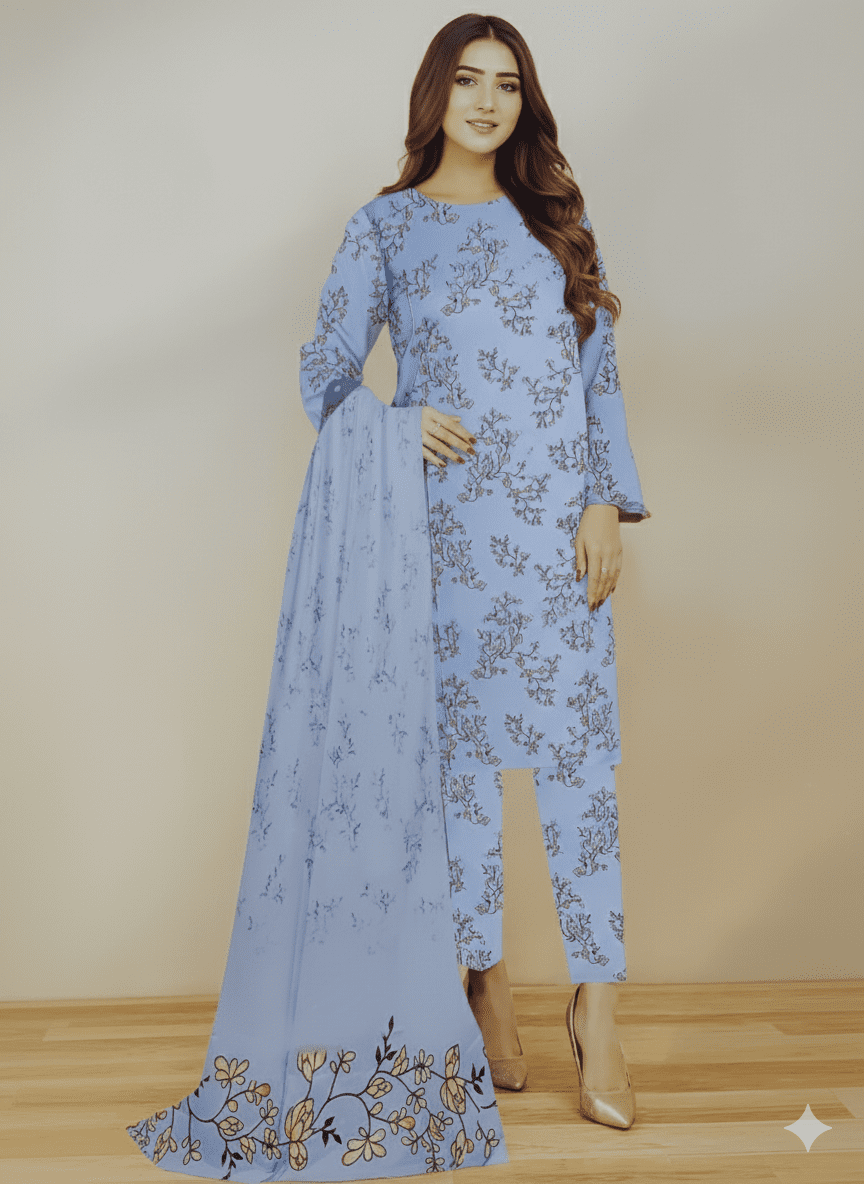 Elegant Blue Floral Linen 3 Piece Suit with Matching Dupatta | H.S-09-LElegant Blue Floral Linen 3 Piece Suit with Matching Dupatta | H.S-09-L