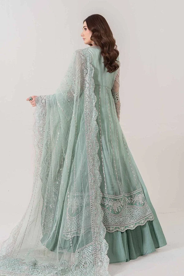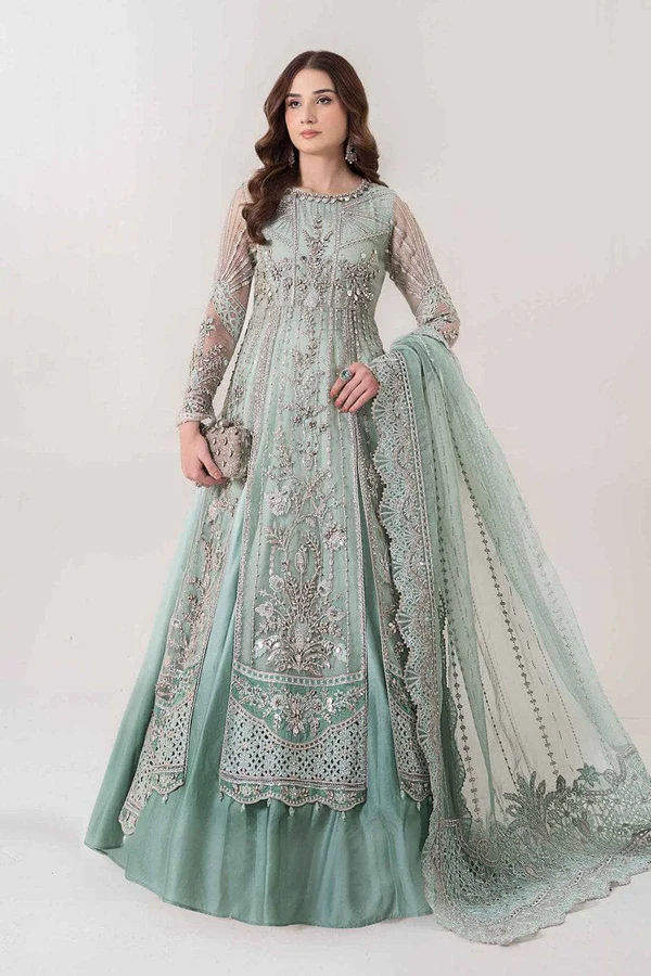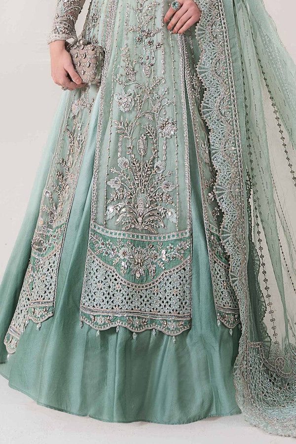 Make a statement in this luxury sage green embroidered organza outfit, designed with exquisite craftsmanship and intricate embellishments. The front bodice, center, and side panels are adorned with hand embroidery, pearls, and crystal work, while the organza sleeves with embellished patti add a touch of regal elegance.