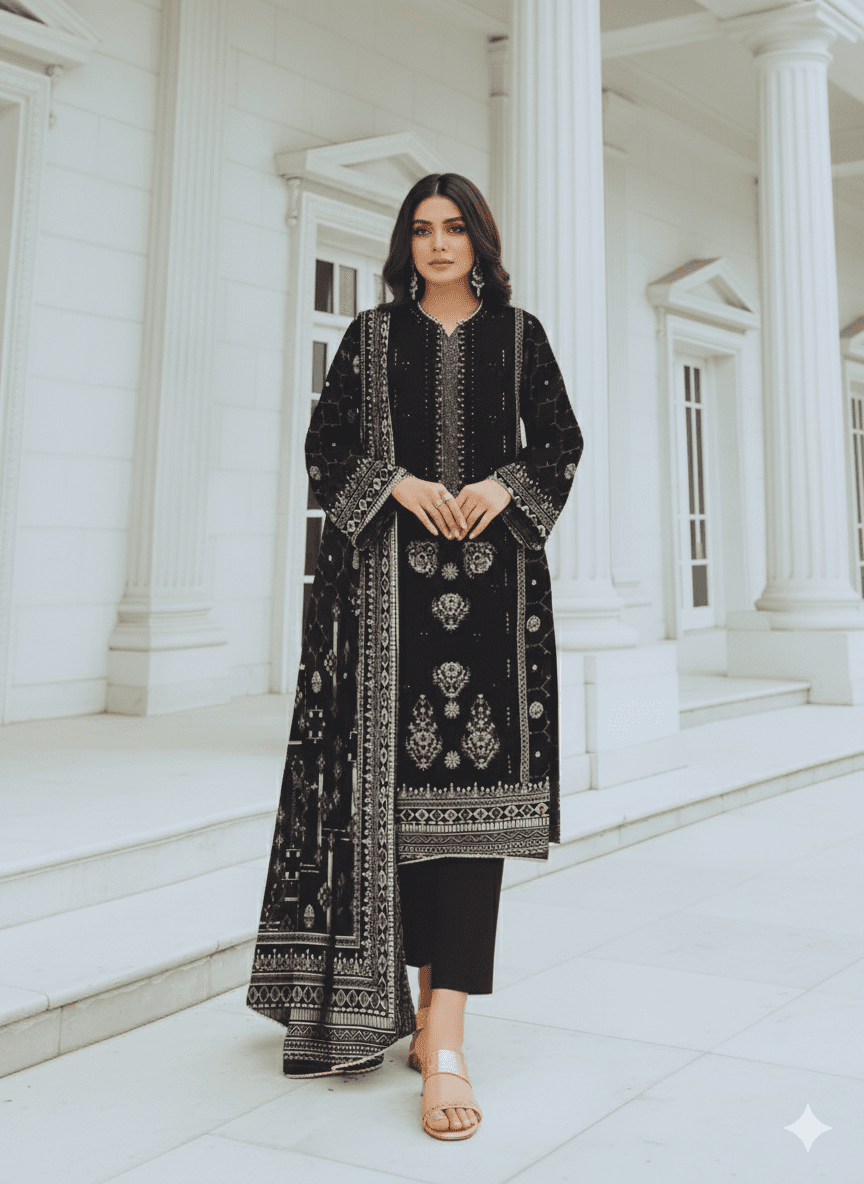 Be the first to review “HS Black Embroidered Shirt Printed Shawl And Trouser | H.S-02L” Cancel reply