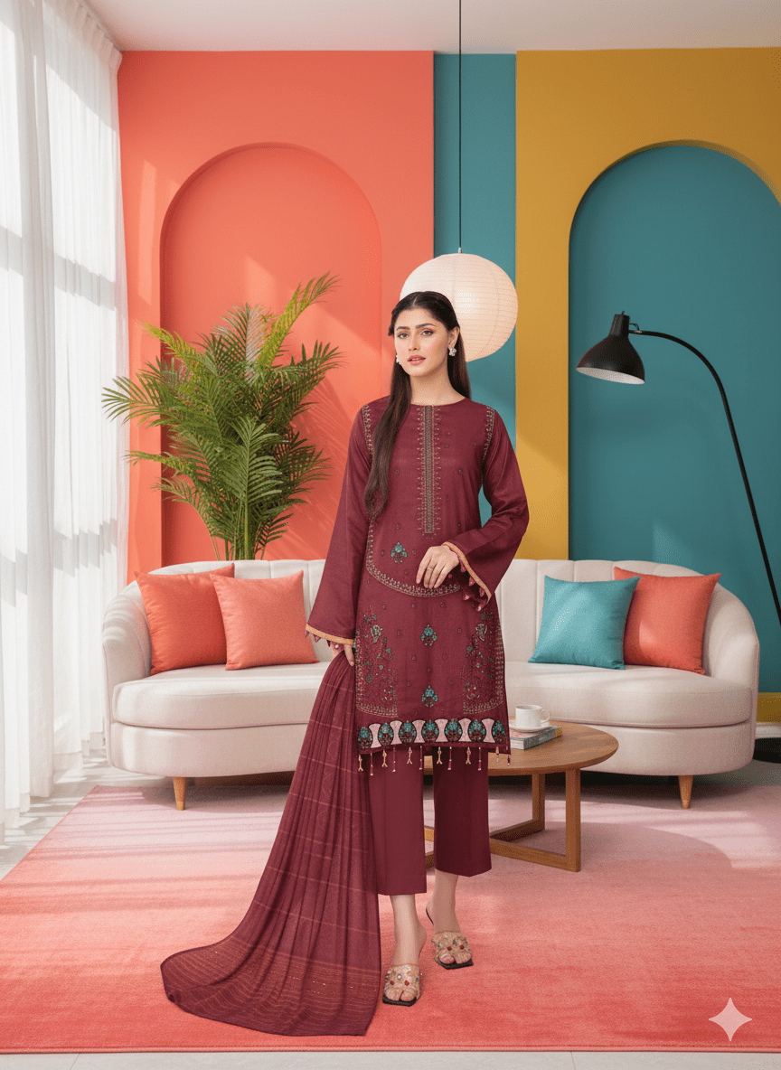 Elevate your winter wardrobe with the HS Branded Dhanak 3PC suit ❄️. Crafted with a luxury heavy embroidered shirt and paired with an exclusive Daabi Kralik Shawl, this masterpiece brings together warmth, style, and timeless elegance. 🌸 Perfect for weddings, festive evenings, and winter gatherings – a must-have for the season!