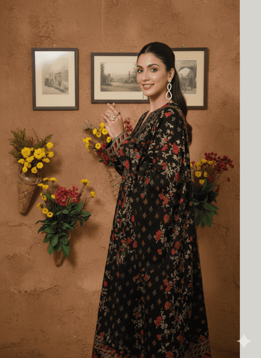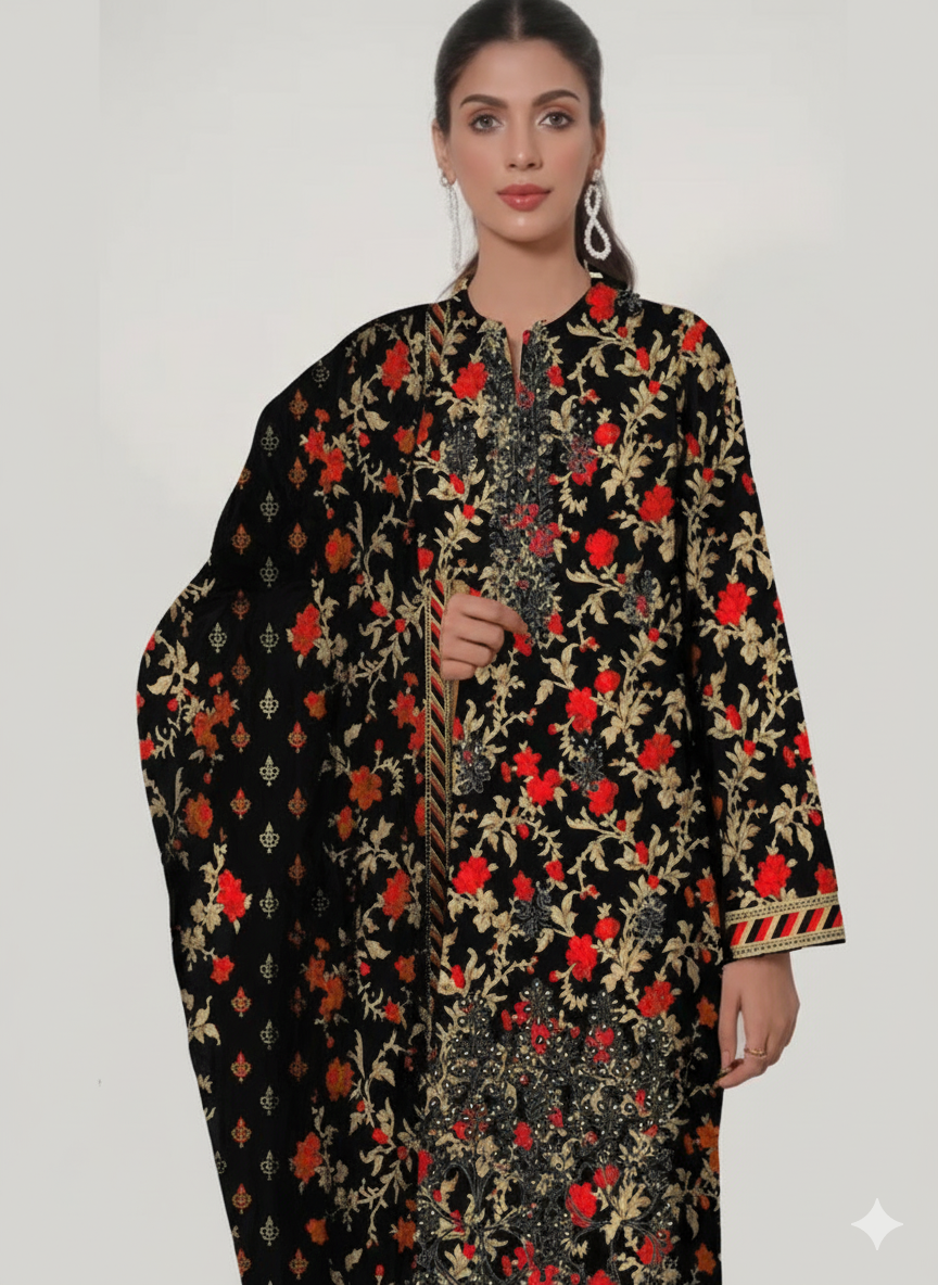 Elevate your style with the HS Dhanak 3 Piece Embroidery Shirt Printed Dupatta Dyed Trouser in Black. This exquisite ensemble features a richly embroidered shirt adorned with intricate floral patterns in vibrant red and gold, complemented by a printed dupatta with a striking black base and delicate motifs. The dyed trouser completes this elegant look, offering a perfect blend of traditional craftsmanship and modern sophistication. Ideal for festive occasions and special events, this set promises to make a timeless impression.