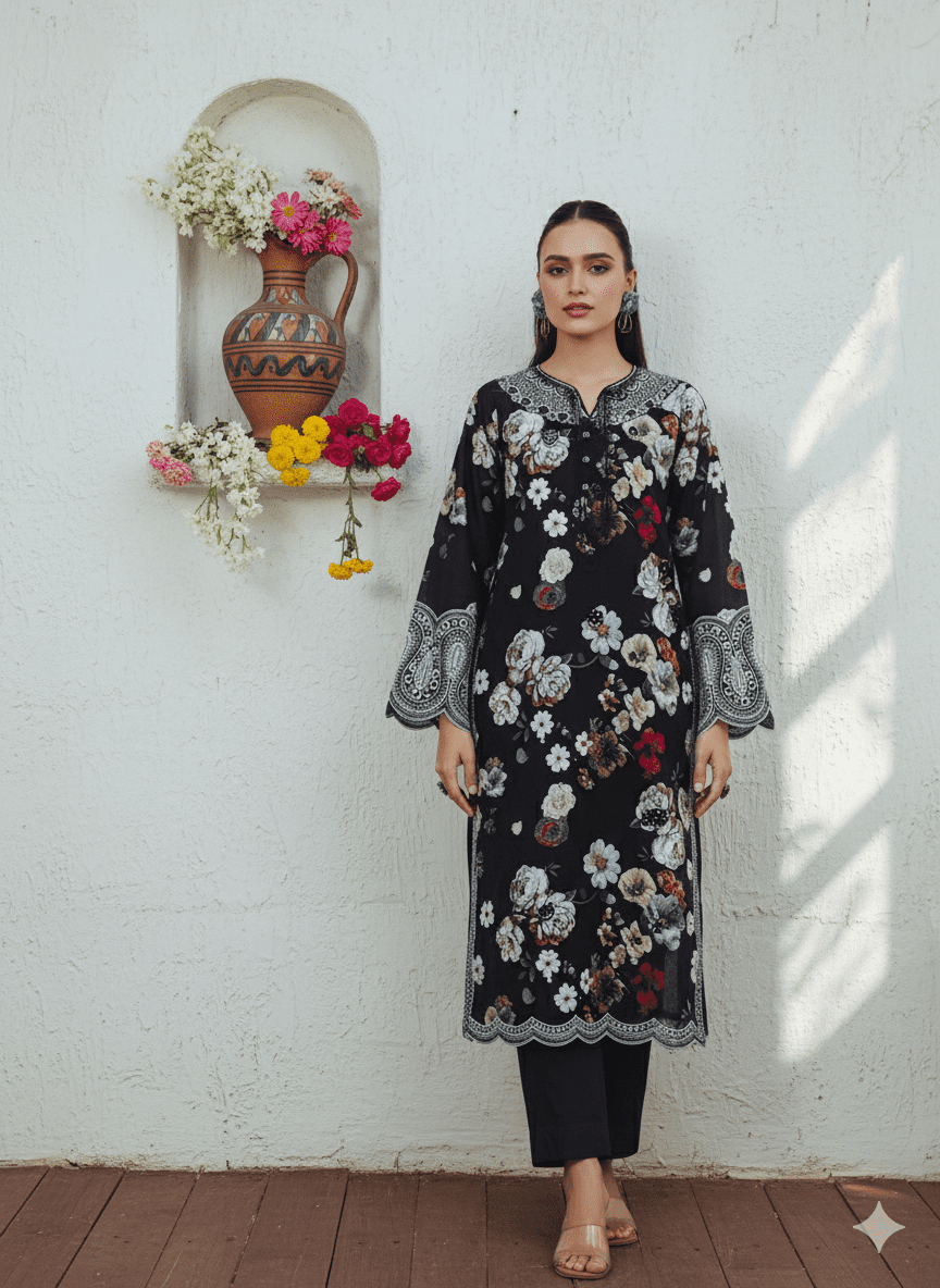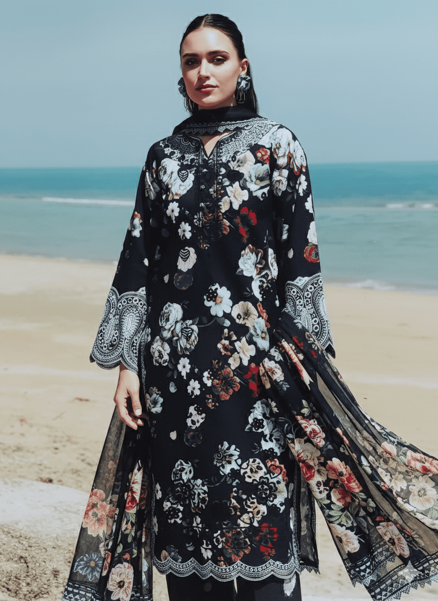 Capture the essence of coastal elegance with the HS Dhanak 3 Piece Embroidery Shirt Printed Dupatta Dyed Trouser in Black. This stunning outfit features a shirt adorned with vibrant floral embroidery in a mix of colors, paired with a lightweight printed dupatta that flows beautifully with its intricate patterns. The dyed trouser completes the set with matching embroidery, offering a perfect blend of traditional artistry and modern comfort. Ideal for beachside events, casual outings, or festive occasions, this ensemble is a must-have for any wardrobe.