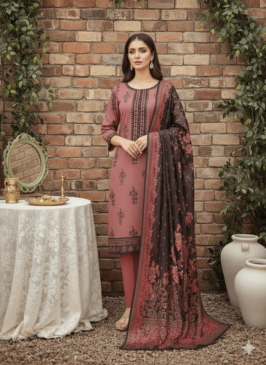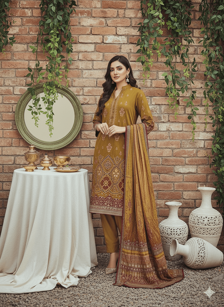 Embrace timeless sophistication with the HS Olive Embroidered Shirt Printed Shawl And Trouser set, a stunning showcase of Pakistani artistry. Crafted from high-quality fabric, this olive ensemble offers a luxurious texture and comfortable fit, ideal for all seasons. The intricately embroidered shirt features elegant floral and geometric patterns with detailed threadwork along the neckline, sleeves, and borders, paired with a rich maroon printed shawl that adds a royal charm. Complemented by matching trousers, this outfit harmonizes traditional craftsmanship with modern elegance. Perfect for Eid celebrations, weddings, festive gatherings, or formal events, this Pakistani women’s suit exudes versatility and grace. Elevate your ethnic wardrobe with this exquisite embroidered kurta set, designed for the modern woman seeking premium Pakistani suits and seasonal fashion trends.