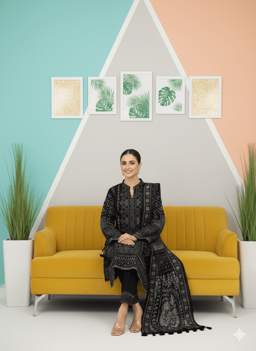 Unveil sophistication with the HS Premium Printed Black Shirt, Printed Shawl, and Trouser – a chic 3-piece unstitched suit from our next winter season collection. Crafted from premium linen fabric, this striking black outfit features intricate printed designs that blend traditional Pakistani artistry with modern elegance. The lightweight, breathable linen ensures exceptional comfort during the cold season, while its versatile style suits casual outings, semi-formal events, or festive gatherings. The unstitched design allows for personalized tailoring to enhance your unique silhouette.