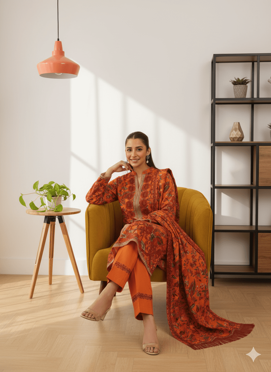 nning unstitched 3-piece suit from our next winter season collection. Crafted from premium linen, this ensemble boasts vibrant orange hues with intricate floral prints, blending elegance with bold sophistication. The lightweight, breathable fabric ensures all-day comfort, perfect for casual meetups, semi-formal occasions, or festive celebrations. The fringed shawl adds a touch of warmth and charm, ideal for chilly evenings. This versatile outfit allows custom tailoring, merging traditional Pakistani artistry with modern flair. A must-have for fashion-savvy women, it promises timeless beauty and comfort. Shop now to add this exquisite piece to your wardrobe and shine this winter season!