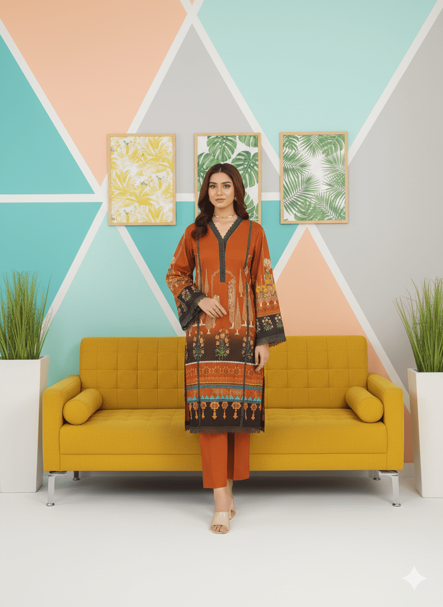 HS PREMIUM PRINTED RUST SHIRT WITH PRINTED SHAWL AND TROUSER | H.S-02PHS PREMIUM PRINTED RUST SHIRT WITH PRINTED SHAWL AND TROUSER | H.S-02P