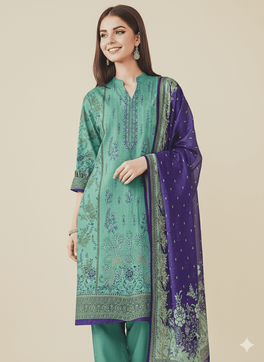 Discover refined elegance with the HS Teal Embroidered Shirt Printed Shawl And Trouser set, a stunning embodiment of Pakistani craftsmanship. Crafted from premium fabric, this teal ensemble offers a luxurious texture and comfortable fit, perfect for any season. The intricately embroidered shirt features delicate floral patterns and detailed threadwork along the neckline, sleeves, and borders, paired with a rich purple printed shawl that enhances its regal appeal. Complemented by matching trousers, this outfit seamlessly blends traditional artistry with modern sophistication. Ideal for Eid celebrations, weddings, casual outings, or festive gatherings, this Pakistani women’s suit radiates grace and versatility. Elevate your ethnic wardrobe with this exquisite embroidered kurta set, designed for the modern woman seeking premium Pakistani suits and seasonal fashion trends.